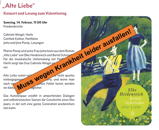 Von Montag, 16. Februar bis Samstag, 28. Februar ist Pfr. Porep im Urlaub. Die seelsorgerliche Vertretung übernimmt dankenswerter Weise Pfr. Herrmann Spingler, Heilig Kreuz, Tel Telefon 0981 96292.