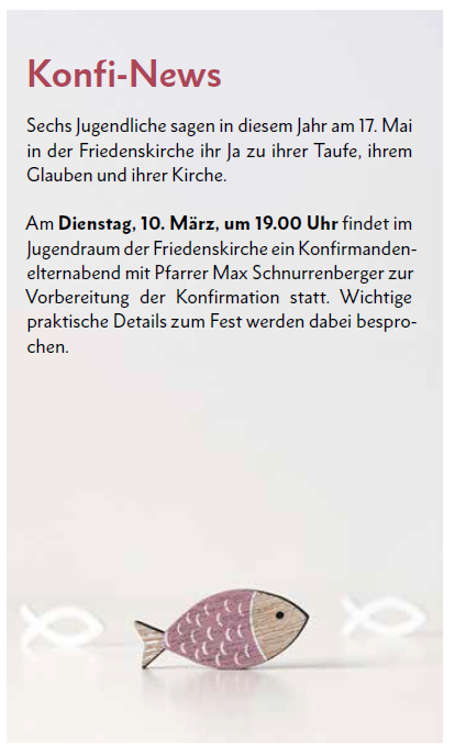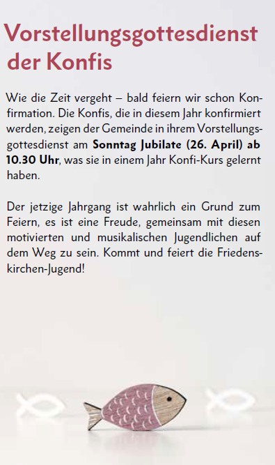 Am Vorabend der Konfirmation ist der Beichtgottesdienst. Rechtzeitig vor der Konfirmation gestalten die Konfirmanden einen eigenen Gottesdienst am Sonntagmorgen.